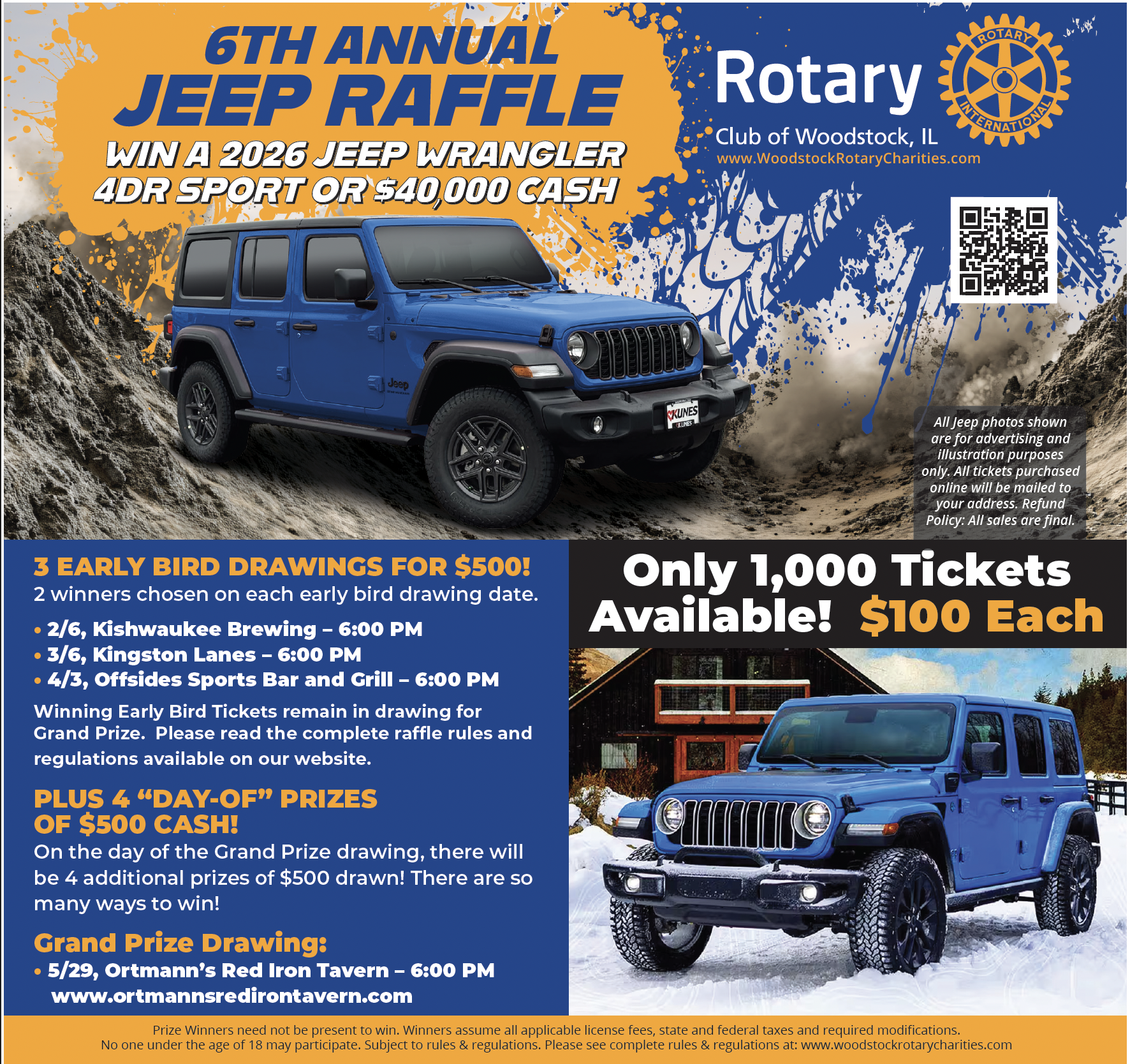 Prize Winners need not be present to win. Winners assume all applicable license fees, state and federal taxes and required modifications. No one under the age of 18 may participate. Subject to rules & regulations. Please see complete rules & regulations at: www.woodstockrotarycharities.com